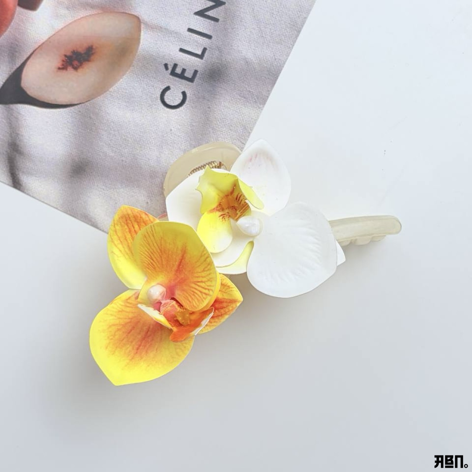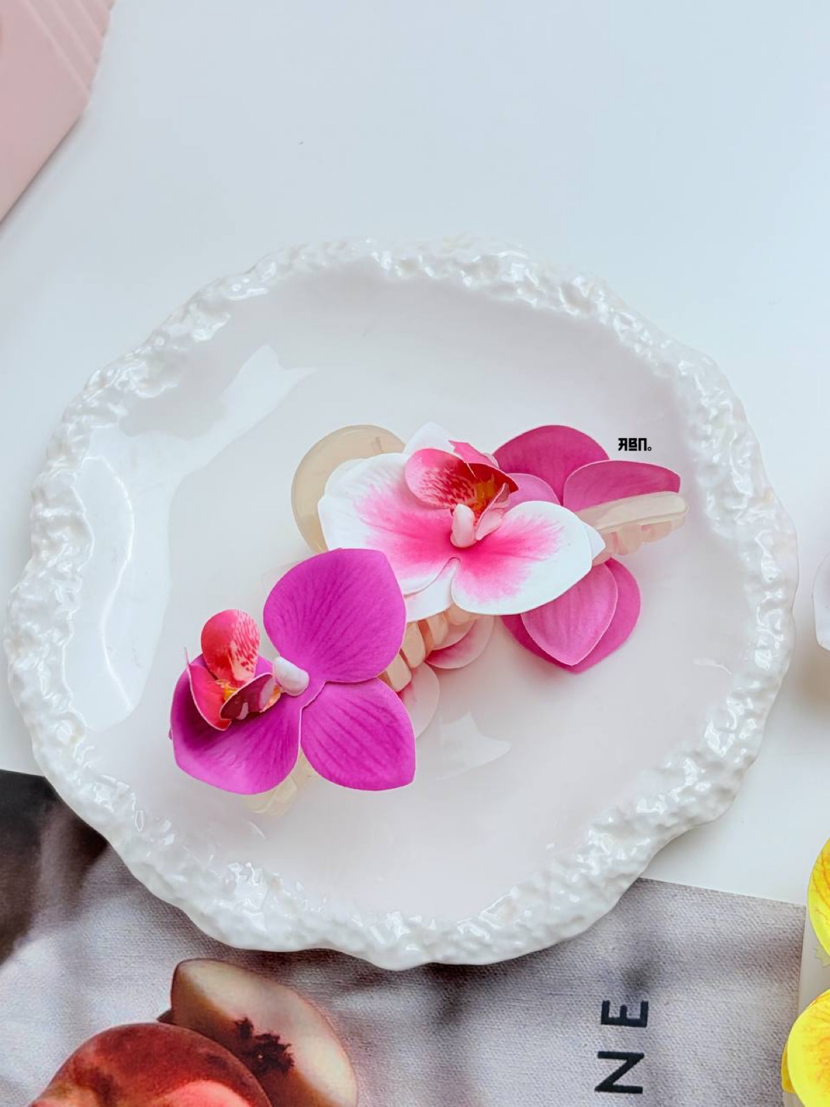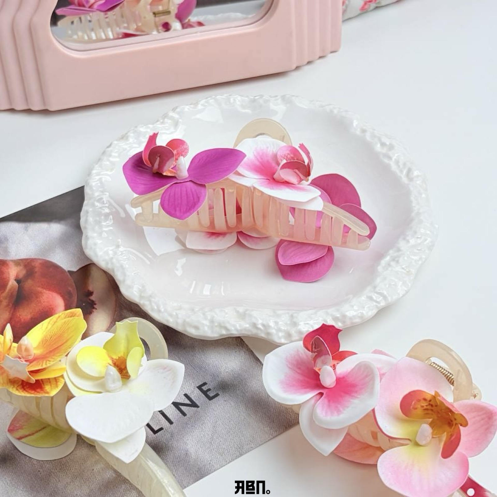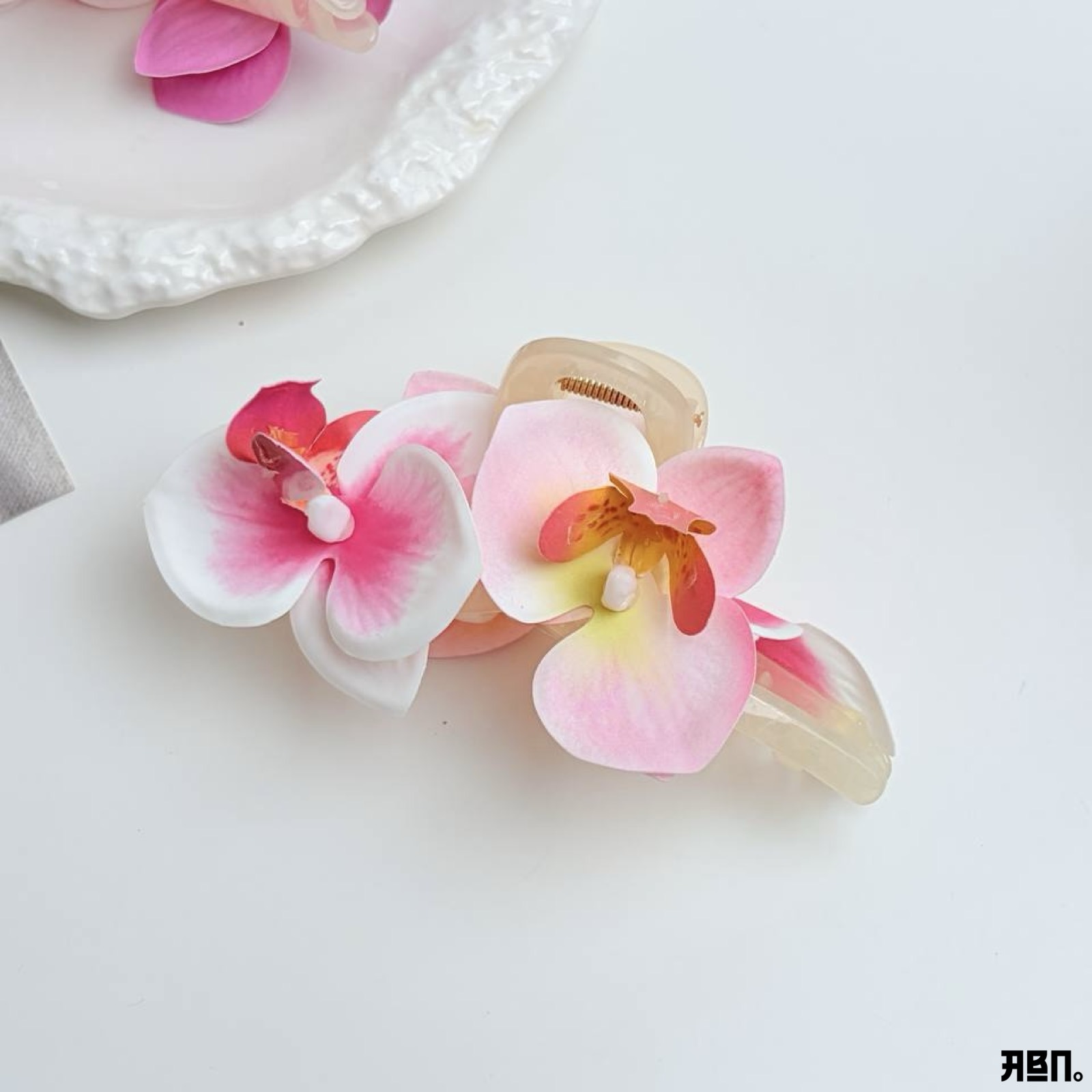 المشبك نفسه مصنوع من مادة الأكريليك المتين بلون شفاف أو كريمي يتناغم مع ألوان الزهور.