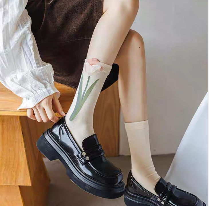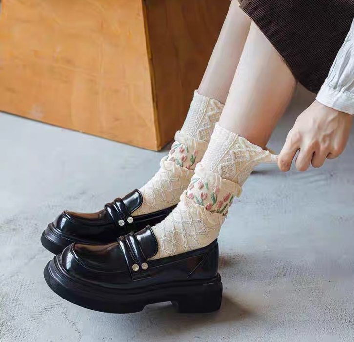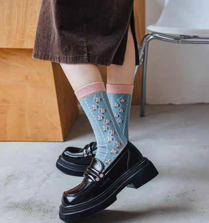 جواريب بنقشات جميلة آسيوية جوارب قطنية بتصميم أنثوي ناعم ونقشات بارزة ، تناسب جمبع الأذواق