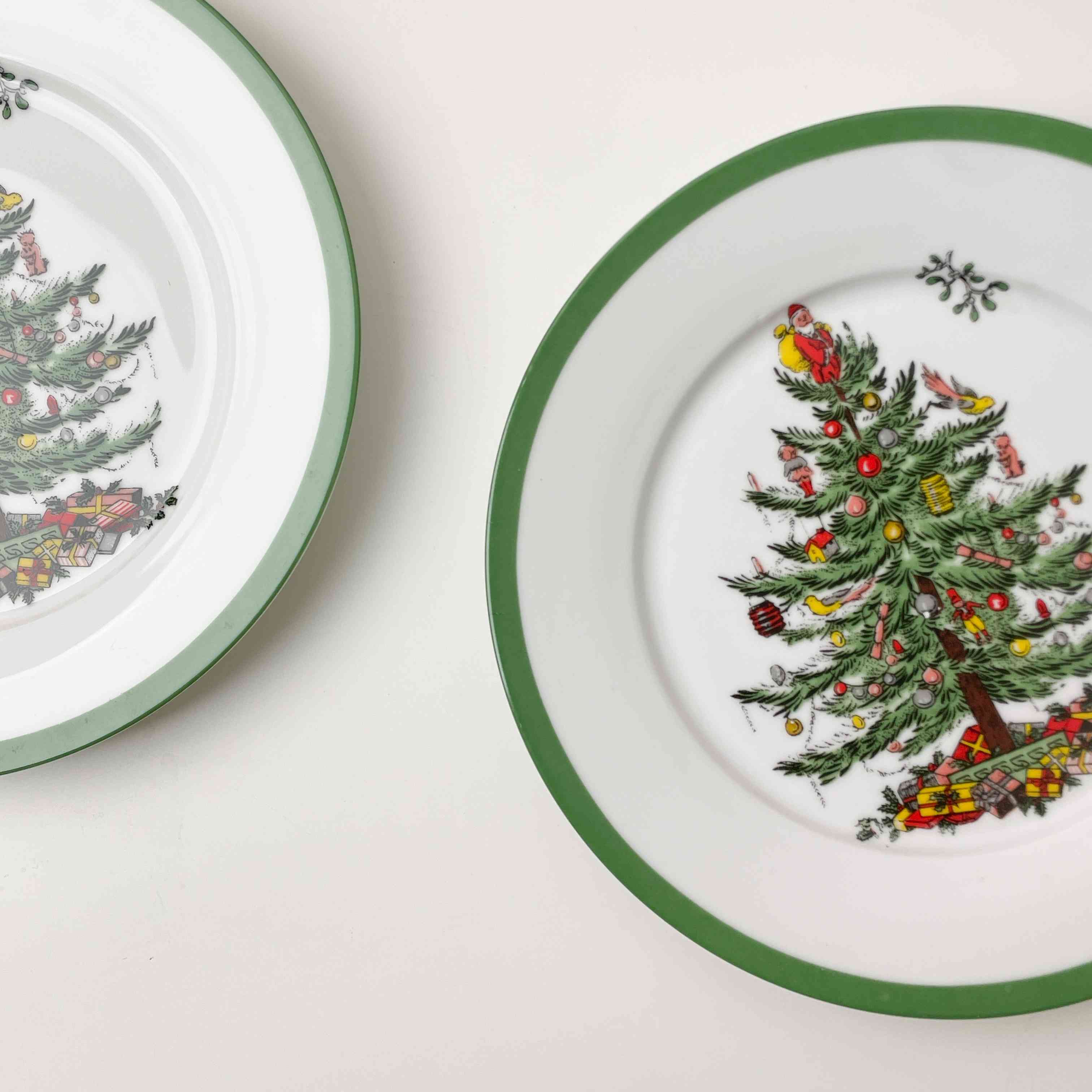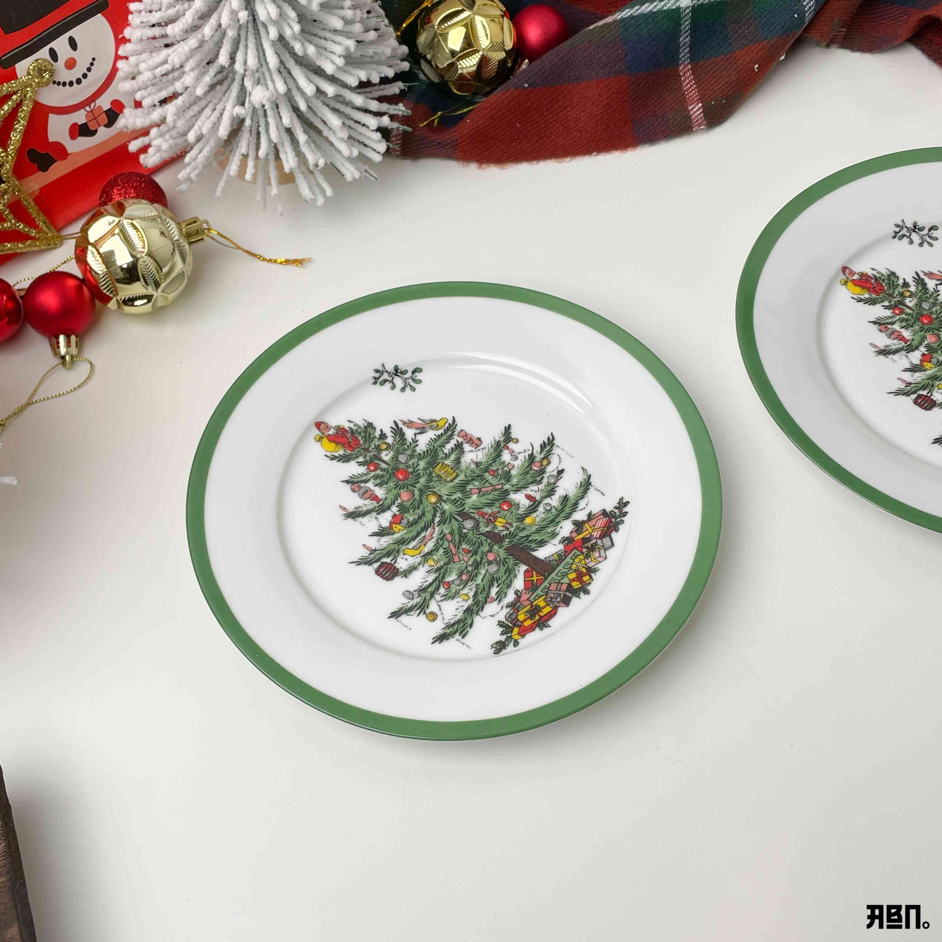 صحن سيراميك دائري أبيض بحواف خضراء ، مُزين برسمة مركزية واضحة لشجرة عيد الميلاد (الكريسماس).