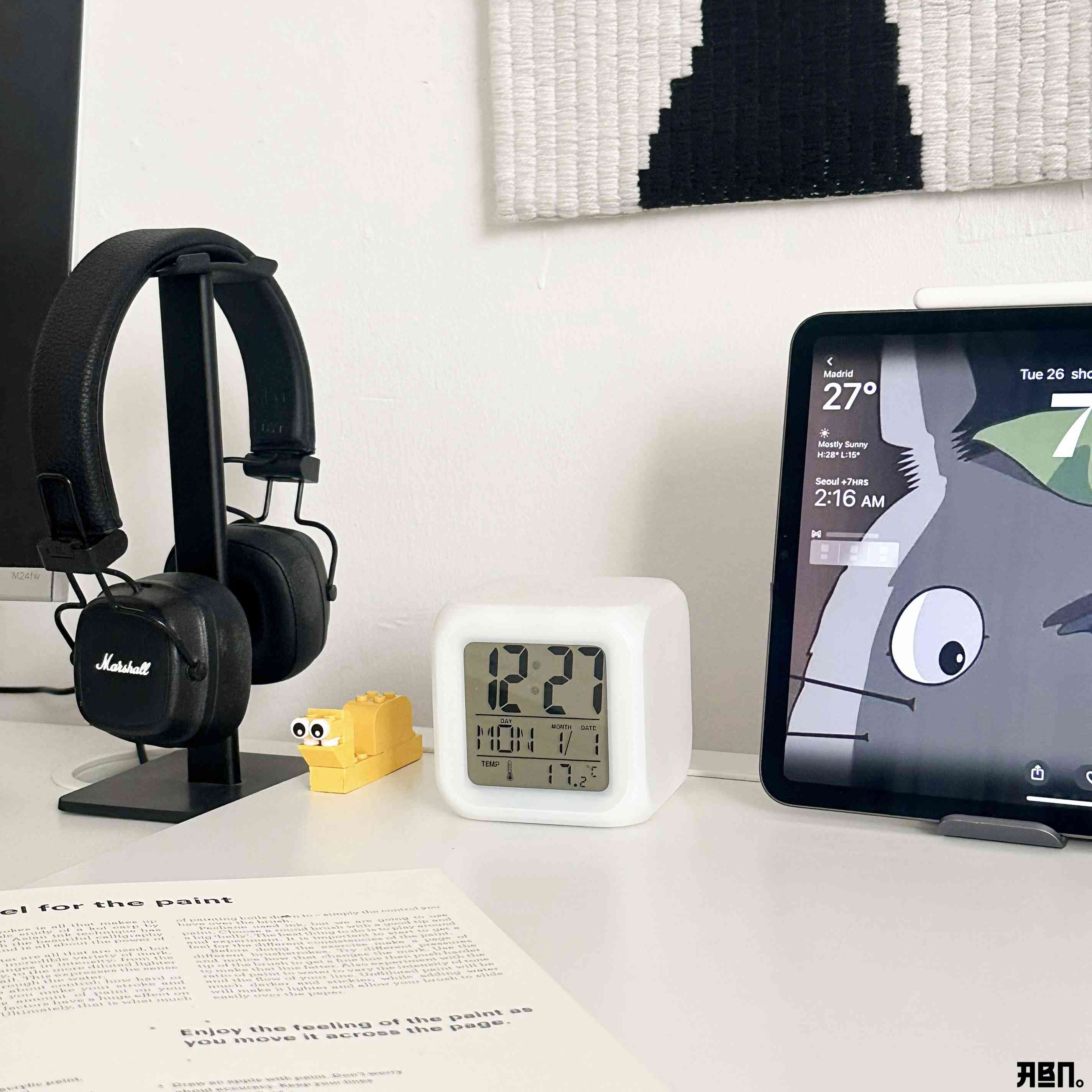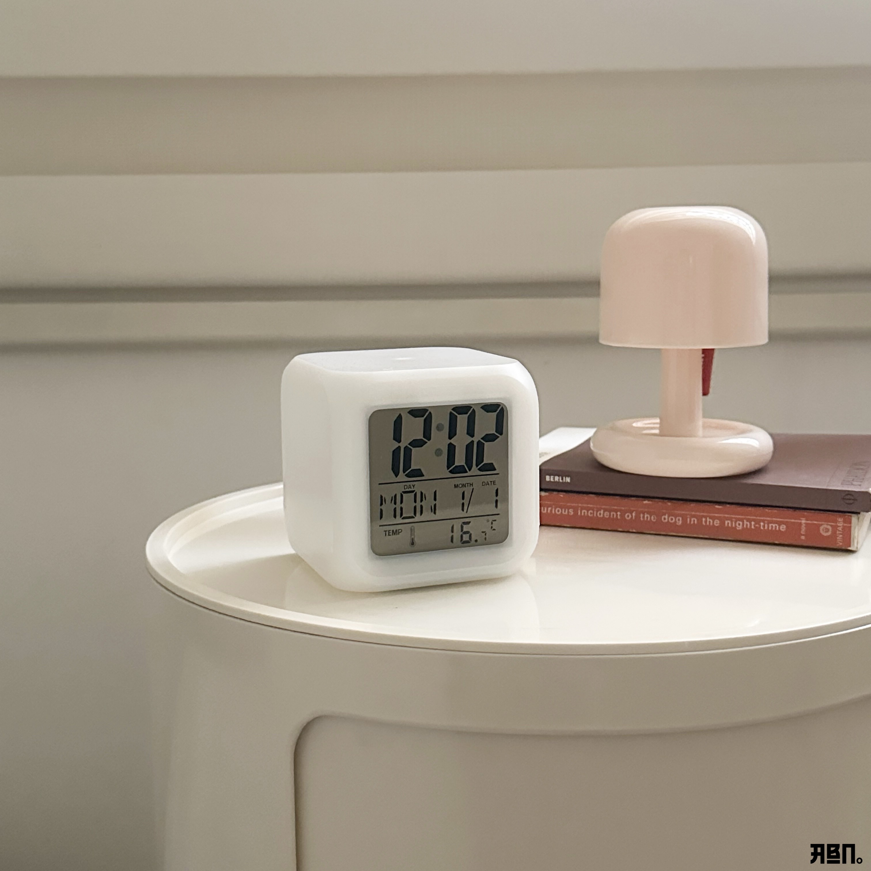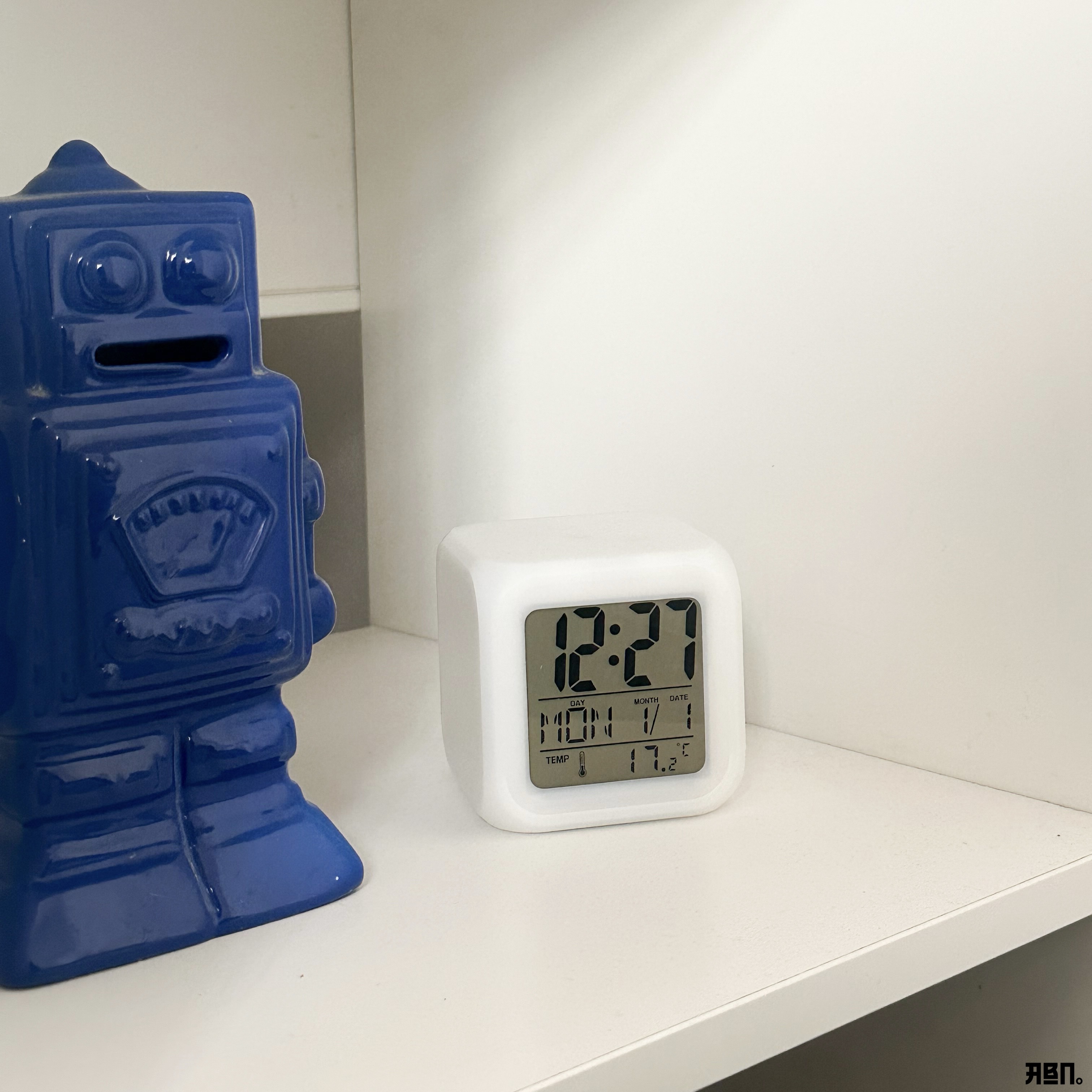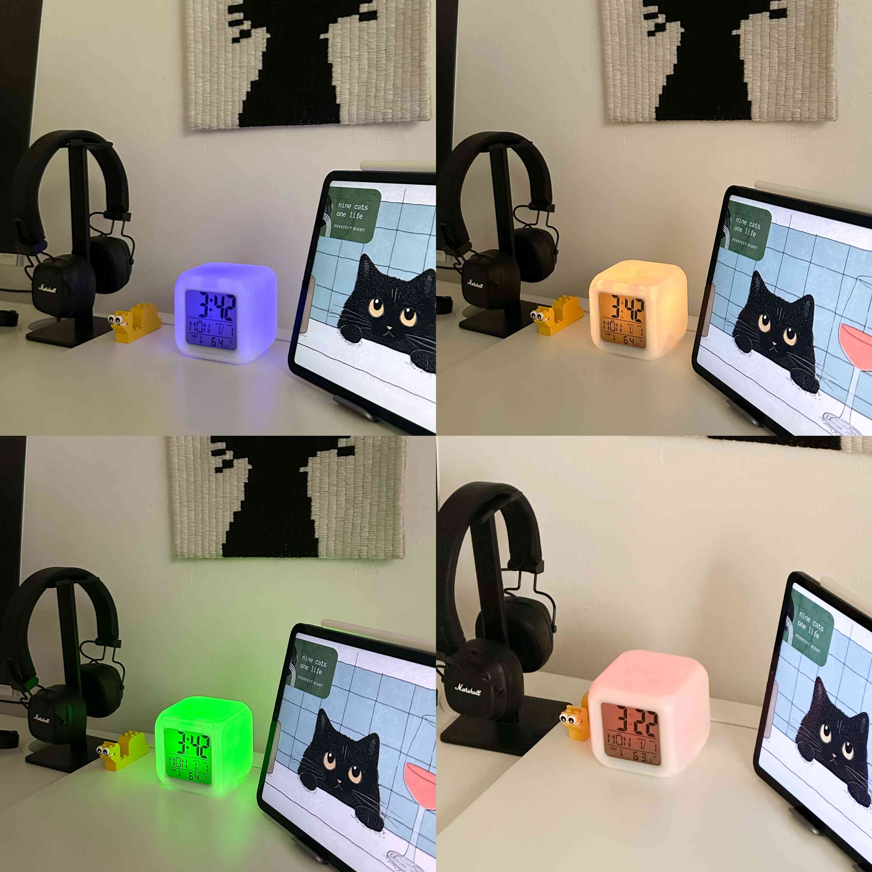 ساعة مكتبية رقمية مضيئة بتصميم مكعب عصري تعرض الوقت والتاريخ ودرجة الحرارة بوضوح، وتتميز بإضاءة LED متغيرة الألوان تضفي لمسة جمالية وهادئة على المكان.